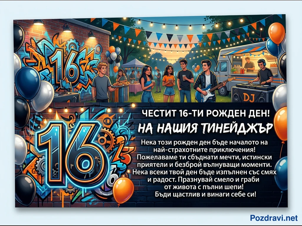 Картичка за рожден ден изобразява оживено парти на открито за 16-годишен тийнейджър. Младежи се забавляват сред украса от балони, гирлянди и графити по тухлени стени, като някои свирят на китара или са диджеи. В горната част се виждат хора около хранителен камион, докато в долната лява част голямо неоново число '16' привлича погледа. Текстът на картичката отправя сърдечни пожелания за приключения, сбъднати мечти и щастливи моменти. Цялостната атмосфера е празнична и младежка, с преобладаващи сини, оранжеви и черни цветове.
