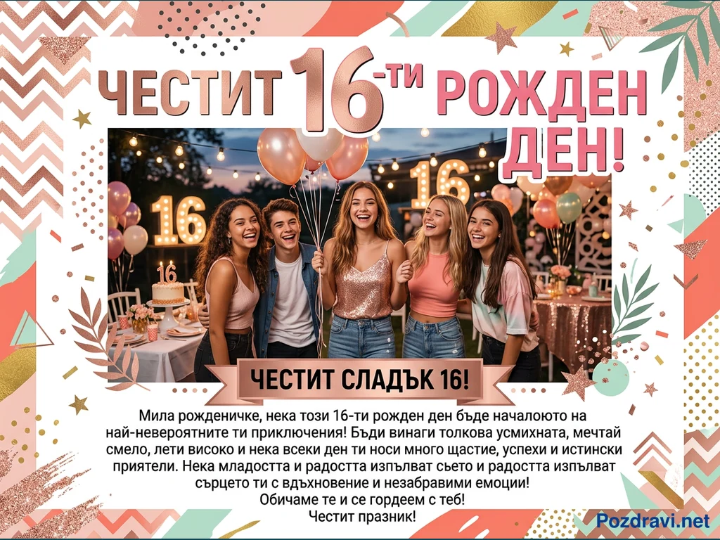 Празнична картичка за 16-ти рожден ден, изпълнена с радост и младежки дух. В центъра са заснети петима усмихнати тийнейджъри, които празнуват на открито вечер, заобиколени от балони, светещи гирлянди и празнична маса с торта. Големи светещи цифри '16' и по-малки върху тортата подчертават повода. Дизайнът е в свежи цветове като розово злато, корал и мента, с бляскави акценти и геометрични шарки, създаващи весело настроение. Картичката съдържа и сърдечно пожелание за рожденичката.