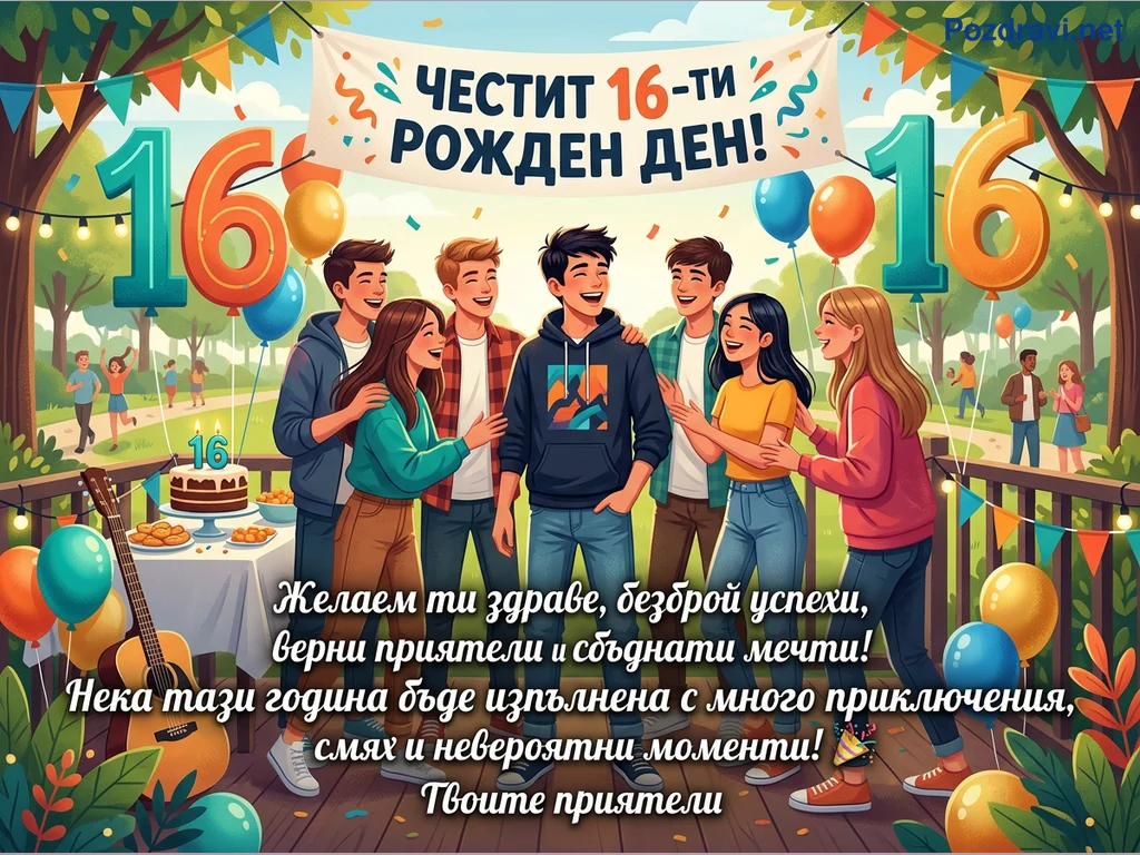 Тази цветна илюстрация изобразява оживено празненство за 16-ти рожден ден на открито в паркова среда. Група от седем усмихнати тийнейджъри, четири момчета и три момичета, са събрани заедно, смеят се и си говорят, обградени от балони, гирлянди и празнични украси. На заден план се виждат други хора, наслаждаващи се на парка, както и маса с торта с надпис '16' и други лакомства. Над тях виси голям транспарант с надпис 'ЧЕСТИТ 16-ТИ РОЖДЕН ДЕН!', а в долната част на картичката е изписано сърдечно пожелание от приятели. Цялостната атмосфера е на радост, приятелство и младежко веселие.