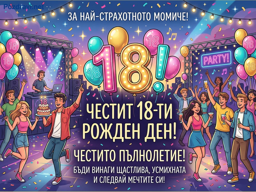 Картичката изобразява оживено парти за 18-ти рожден ден, изпълнено с млади хора, танцуващи и празнуващи под светлините на прожектори и падащи конфети. В центъра са разположени големи, светещи цифри '18!', заобиколени от множество цветни балони, също с числото '18'. Група приятели се забавляват, като един от тях държи торта, а друг е зад DJ пулт, докато неонов надпис 'PARTY!' свети на заден план. Текстът на български език поздравява 'ЗА НАЙ-СТРАХОТНОТО МОМИЧЕ!', 'ЧЕСТИТ 18-ТИ РОЖДЕН ДЕН!', 'ЧЕСТИТО ПЪЛНОЛЕТИЕ!' и пожелава 'БЪДИ ВИНАГИ ЩАСТЛИВА, УСМИХНАТА И СЛЕДВАЙ МЕЧТИТЕ СИ!'.