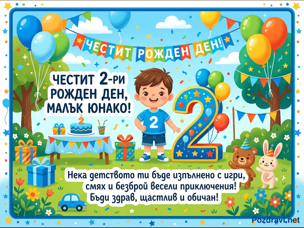 Тази цветна илюстрация е празнична картичка за втори рожден ден. В центъра е усмихнато момченце в синя тениска с номер 2, застанало до голяма, украсена цифра '2'. Сцената е изпълнена с балони, конфети, подаръци, торта и масичка, създавайки весела атмосфера на открито. В долния десен ъгъл са изобразени сладки мече и зайче, а в долния ляв – малка синя кола. Картичката съдържа пожелания за щастливо детство, изпълнено с игри и приключения.