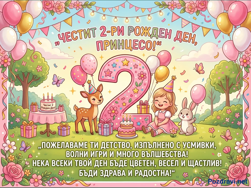 Тази жизнерадостна картичка за рожден ден е изпълнена с празнична атмосфера, подходяща за 2-годишно момиченце. В центъра е голямо розово число '2', украсено със звезди и цветя, а около него са разположени усмихнато момиченце, еленче и зайче, всички с парти шапки. Сцената е допълнена от цветни балони, подаръци, торти и разпръснати конфети, на фона на зелен пейзаж с дървета и цветя под небе с гирлянди и светлини. Надписът 'ЧЕСТИТ 2-РИ РОЖДЕН ДЕН, ПРИНЦЕСО!' и сърдечно пожелание допринасят за веселото и вълшебно настроение.