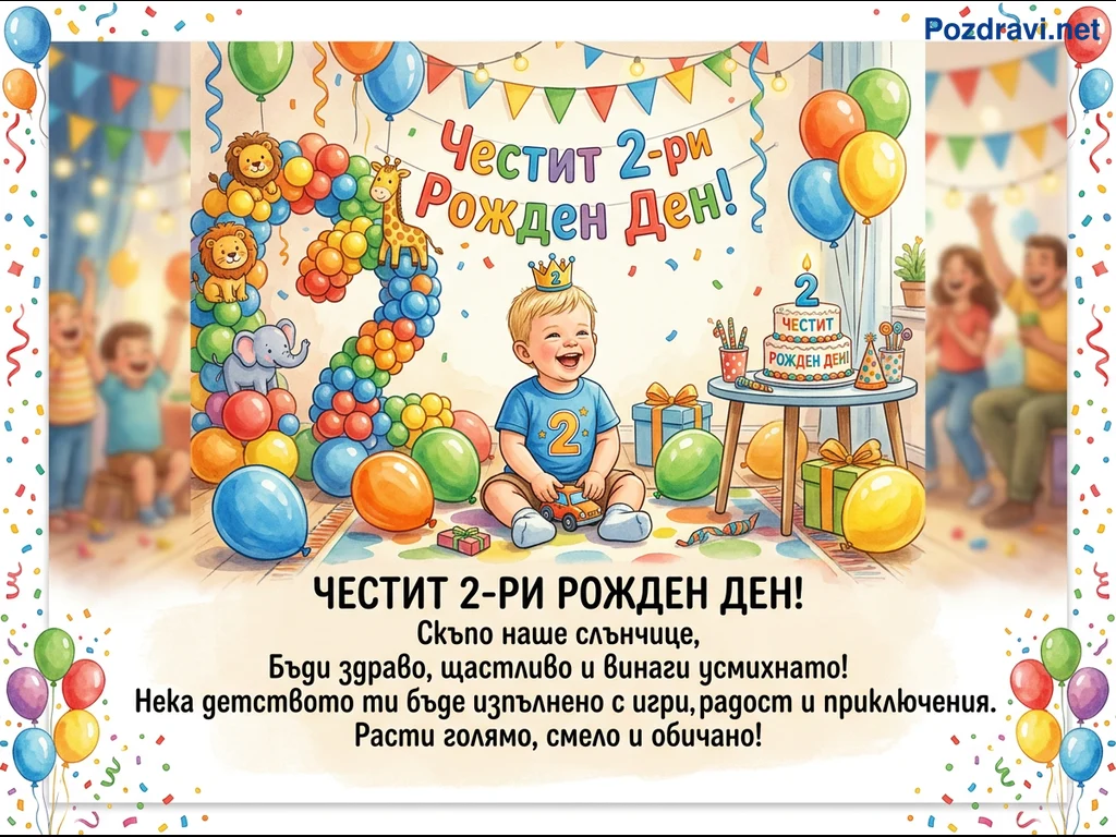 Тази цветна картичка празнува втория рожден ден на дете, изобразявайки усмихнато момченце с корона, седнало сред балони и подаръци. На заден план се виждат размазани фигури на празнуващи възрастни и деца, допринасящи за веселата атмосфера. Голяма цифра '2', оформена от балони и украсена с фигурки на животни, е централен елемент от декорацията. Картичката съдържа надпис 'Честит 2-ри Рожден Ден!' и топли пожелания за щастливо детство, изпълнено с игри и приключения.