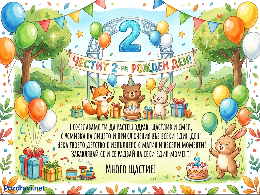 Ключови фрази: 2-ри рожден ден, поздравителна картичка, детски рожден ден, анимационни животни, честит рожден ден 2
