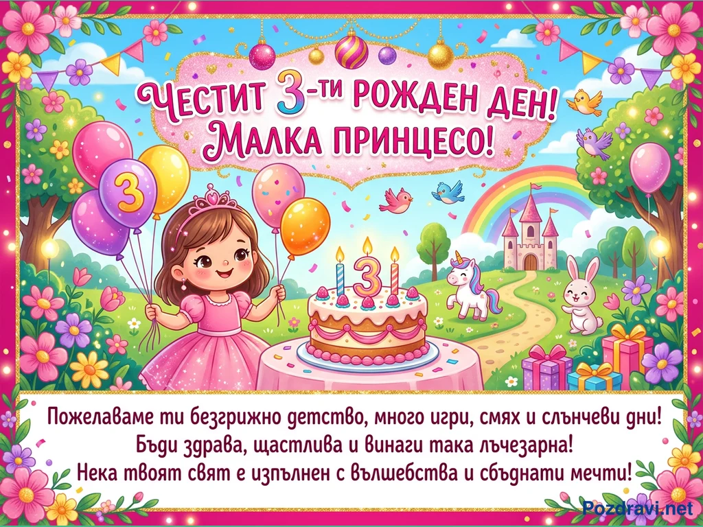 Тази цветна поздравителна картичка е за 3-ти рожден ден на малка принцеса. На нея е изобразено усмихнато момиченце в розова рокля с корона, държащо балони, до торта със свещички във формата на числото 3. Фонът е приказна сцена с розов замък, дъга, еднорог, зайче и летящи птички, заобиколени от цветя и конфети. Картичката носи послание 'Честит 3-ти рожден ден! Малка принцесо!' и пожелания за безгрижно детство.