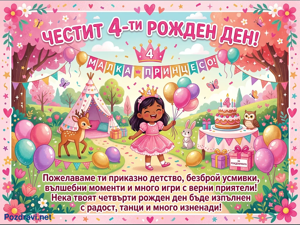 Тази цветна картичка за рожден ден изобразява радостно момиченце в розова рокля на принцеса и корона, празнуващо своя четвърти рожден ден. Тя държи балони, заобиколена от приказен пейзаж с палатка тип типи, еленче, зайче и бухал. На маса е поставена торта с цифра '4' и подаръци, а цялата сцена е изпълнена с балони, цветя и пеперуди. Картичката носи надпис 'ЧЕСТИТ 4-ТИ РОЖДЕН ДЕН! МАЛКА ПРИНЦЕСО!' и сърдечни пожелания за щастливо детство.