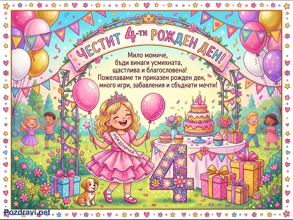 Тази цветна картичка е посветена на 4-тия рожден ден на момиченце. В центъра е усмихната русокоса рожденичка в розова рокля и корона, държаща балони и магическа пръчица, с надпис 'РОЖДЕНИЧКА'. Около нея е разположена празнична маса с голяма торта, кексчета и подаръци, както и светеща декоративна цифра '4'. Фонът е изпълнен с балони, гирлянди, играещи деца и малко кученце. Надписът 'ЧЕСТИТ 4-ти РОЖДЕН ДЕН!' и мило пожелание допълват радостната атмосфера.