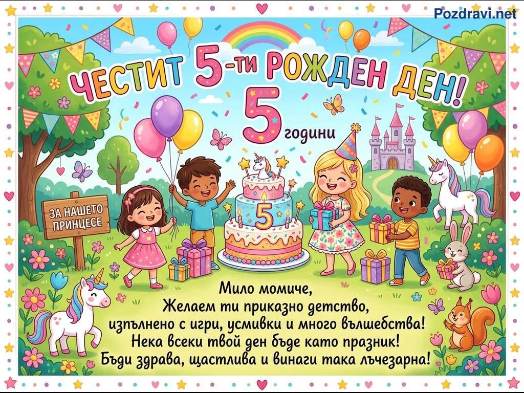 Тази цветна илюстрация е празнична картичка за 5-ти рожден ден на момиче. Тя показва щастливи деца, еднорози, зайче и катеричка в приказна обстановка с балони, конфети и замък на заден план. В центъра е голяма торта на няколко етажа с цифрата '5', заобиколена от подаръци. Надписът 'ЧЕСТИТ 5-ти РОЖДЕН ДЕН!' и мило пожелание допълват радостната атмосфера.