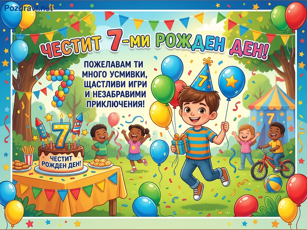 Тази цветна картичка за 7-ми рожден ден изобразява щастливо момче с парти шапка и подарък, заобиколено от други усмихнати деца в празнична обстановка. На преден план е поставена маса с торта, украсена със свещи във формата на числото 7 и ракети, както и други лакомства. Сцената е изпълнена с многоцветни балони, конфети и гирлянди, създаващи весела атмосфера на детско парти. В далечината се вижда циркова шатра, а надписът гласи 'ЧЕСТИТ 7-МИ РОЖДЕН ДЕН!' с пожелания за усмивки и приключения.