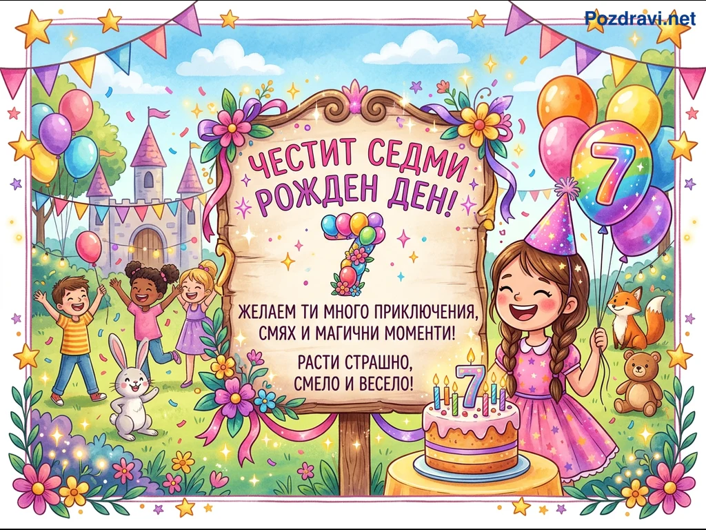Тази жизнерадостна илюстрация е картичка за седми рожден ден, изпълнена с празнично настроение. В центъра е усмихнато момиченце с парти шапка, държащо балони с числото 7, до торта със седем свещи. Около нея други деца, зайче и лисиче празнуват в приказна обстановка с замък, балони и конфети. Голям дървен надпис гласи 'ЧЕСТИТ СЕДМИ РОЖДЕН ДЕН!' и пожелания за приключения, смях и магични моменти. Цялата сцена е ярка, цветна и излъчва радост и веселие.