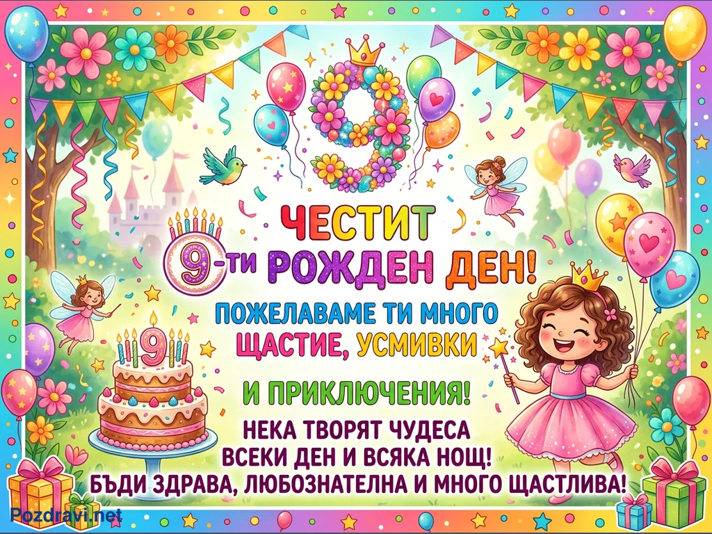 Тази цветна и празнична картичка е посветена на 9-ти рожден ден. Тя изобразява усмихнато момиченце с корона и розова рокля, заобиколено от феи, балони и конфети, на фона на приказен замък и дървета. В долния ляв ъгъл има двуетажна торта с девет свещи, а навсякъде са разпръснати подаръци и декорации. Централното послание гласи 'ЧЕСТИТ 9-ти РОЖДЕН ДЕН! ПОЖЕЛАВАМЕ ТИ МНОГО ЩАСТИЕ, УСМИВКИ И ПРИКЛЮЧЕНИЯ! НЕКА ТВОРЯТ ЧУДЕСА ВСЕКИ ДЕН И ВСЯКА НОЩ! БЪДИ ЗДРАВА, ЛЮБОЗНАТЕЛНА И МНОГО ЩАСТЛИВА!'.