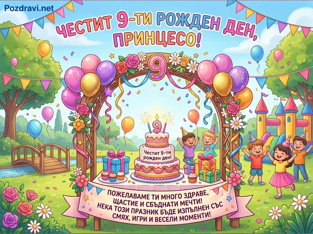 Тази цветна илюстрация изобразява оживено празненство за 9-ти рожден ден на открито. В центъра е разположена голяма торта с горящи свещи във формата на числото 9, заобиколена от подаръци и кексчета под арка, украсена с балони и цветя. Весели деца с парти шапки се радват на празника, някои близо до тортата, други играят до надуваем замък. Надписът 'ЧЕСТИТ 9-ТИ РОЖДЕН ДЕН, ПРИНЦЕСО!' доминира в горната част, а долният банер изразява пожелания за здраве, щастие и сбъднати мечти. Сцената е изпълнена с конфети, зелени дървета, мост над река и ясно синьо небе, създавайки радостна атмосфера.