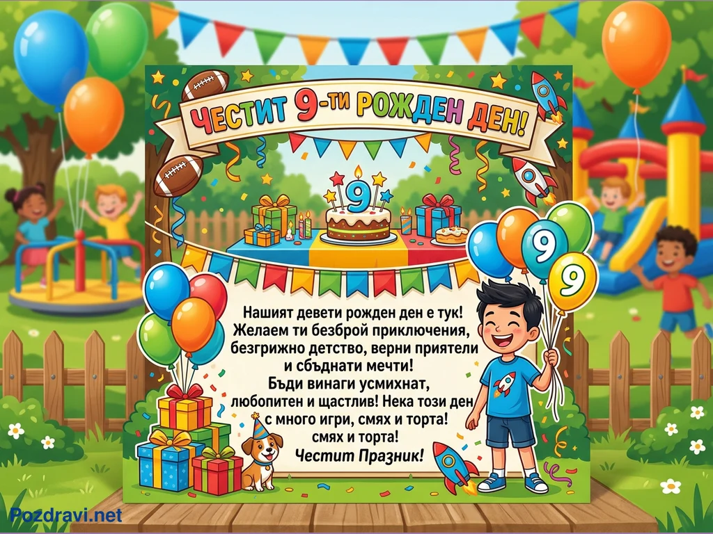 Тази цветна илюстрация е поздравителна картичка за девети рожден ден, изобразяваща оживено парти на открито. В центъра е разположен надпис 'ЧЕСТИТ 9-ти РОЖДЕН ДЕН!', заобиколен от празнична украса като гирлянди, конфети и ракети. На преден план се вижда усмихнато момче, държащо балони с цифрата '9', както и купчина подаръци и малко кученце с парти шапка. На масата има торта с девет свещи и още подаръци, а на заден план други деца играят на въртележка и пързалка, създавайки весела атмосфера. Картичката съдържа и текст с пожелания за безгрижно детство и много игри.