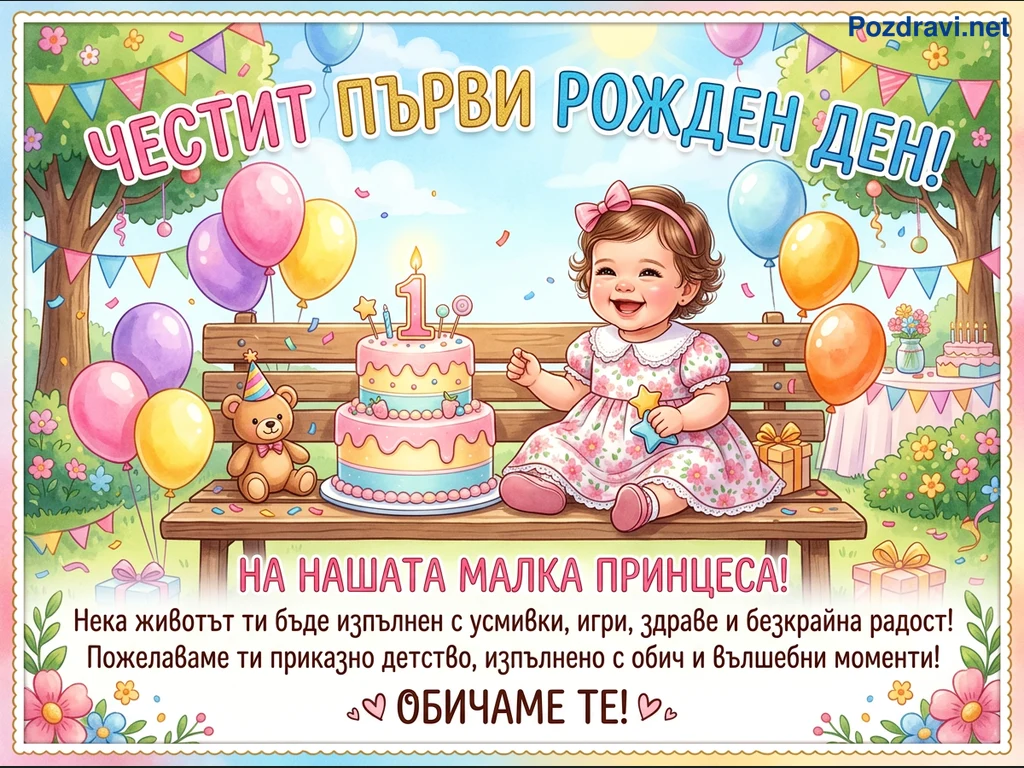 Тази весела и цветна картичка отбелязва първия рожден ден на момиченце. В центъра е усмихнато бебе в розова рокля, седнало на дървена пейка до двуетажна торта с цифра '1' и плюшено мече. Около тях летят пъстри балони и конфети, а фонът е украсен с гирлянди и празнична маса с подаръци. Надписът 'ЧЕСТИТ ПЪРВИ РОЖДЕН ДЕН! НА НАШАТА МАЛКА ПРИНЦЕСА!' предава топли пожелания за щастливо и приказно детство. Цялостната композиция излъчва радост и нежност.