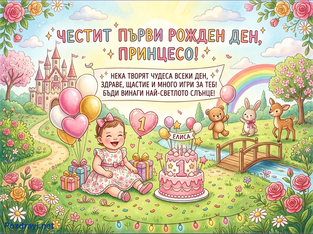 Тази илюстрация изобразява радостен първи рожден ден на момиченце на име Елиса, облечено в розова рокля, седнало сред подаръци и розова торта с цифра '1'. На заден план се вижда приказен замък, а на преден план има поляна с цветя, мост над река и горски животни като мече, зайче и еленче. Небето е озарено от слънце и дъга, а надписът гласи 'ЧЕСТИТ ПЪРВИ РОЖДЕН ДЕН, ПРИНЦЕСО!' с пожелание за чудеса, здраве, щастие и много игри. Цялата сцена е изпълнена с балони, конфети и гирлянди, създавайки весела и празнична атмосфера.