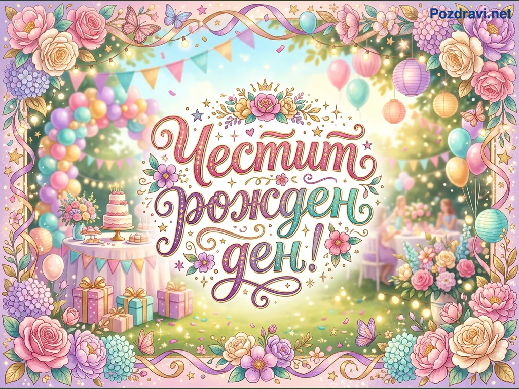 Тази празнична картичка изобразява весело тържество на открито, рамкирано от нежни пастелни цветя, панделки и пеперуди. В центъра е изписан надпис 'Честит рожден ден!' с богато украсени, многоцветни букви. На преден план отляво се вижда маса с торта, кексчета и подаръци, а на заден план са разположени балони, гирлянди от лампички и хора, празнуващи в градина. Цялостната атмосфера е изпълнена с радост и светлина, създавайки усещане за вълшебен рожден ден.
