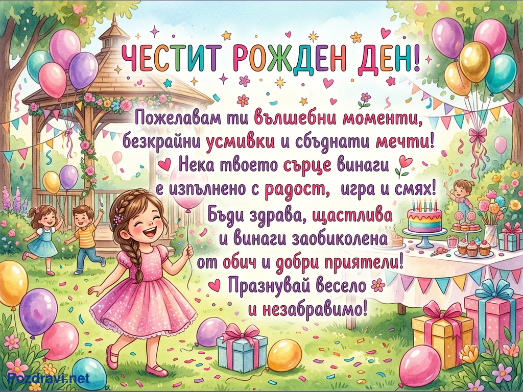 Тази цветна илюстрация изобразява оживено детско парти за рожден ден на открито. В центъра е усмихнато момиченце в розова рокля, държащо балон, заобиколено от други играещи деца, балони и разпръснати конфети. На заден план се вижда беседка, украсена с гирлянди, а отдясно има маса с торта, кексчета и подаръци. Картичката носи надпис 'ЧЕСТИТ РОЖДЕН ДЕН!' и сърдечно пожелание за вълшебни моменти, радост и добри приятели.