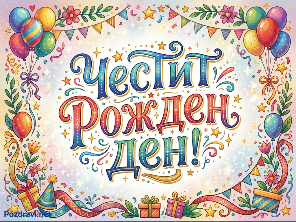 Ярка и празнична поздравителна картичка с централен надпис 'Честит Рожден Ден!' в многоцветни, декоративни букви. Композицията е богато украсена с балони, разпръснати конфети, звезди, панделки, подаръци и малки цветя, рамкиращи текста. Фонът е светъл и искрящ, създавайки весело и тържествено настроение. Цялостният дизайн е изпълнен с жизнени цветове и детайли, идеални за рожден ден.