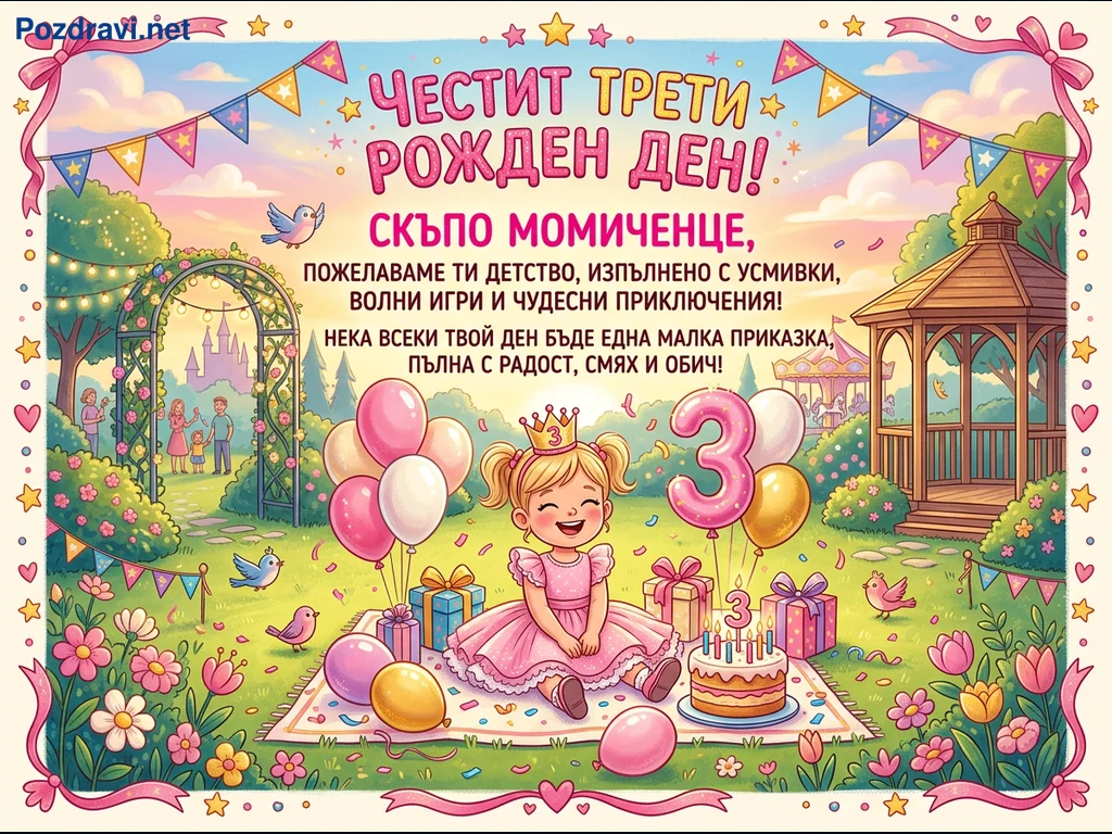 Тази цветна илюстрация е поздравителна картичка за трети рожден ден на момиченце. В центъра е изобразено усмихнато русокосо момиченце в розова рокля и корона, седнало на одеяло сред балони, подаръци и торта със свещи. Зад нея се разкрива приказна паркова обстановка с арка, замък, беседка и въртележка, където се виждат и други хора. Небето е украсено с празнични гирлянди, а текстът отправя топли пожелания за детство, изпълнено с усмивки, игри и приключения. Цялостната композиция излъчва радост и празнично настроение.