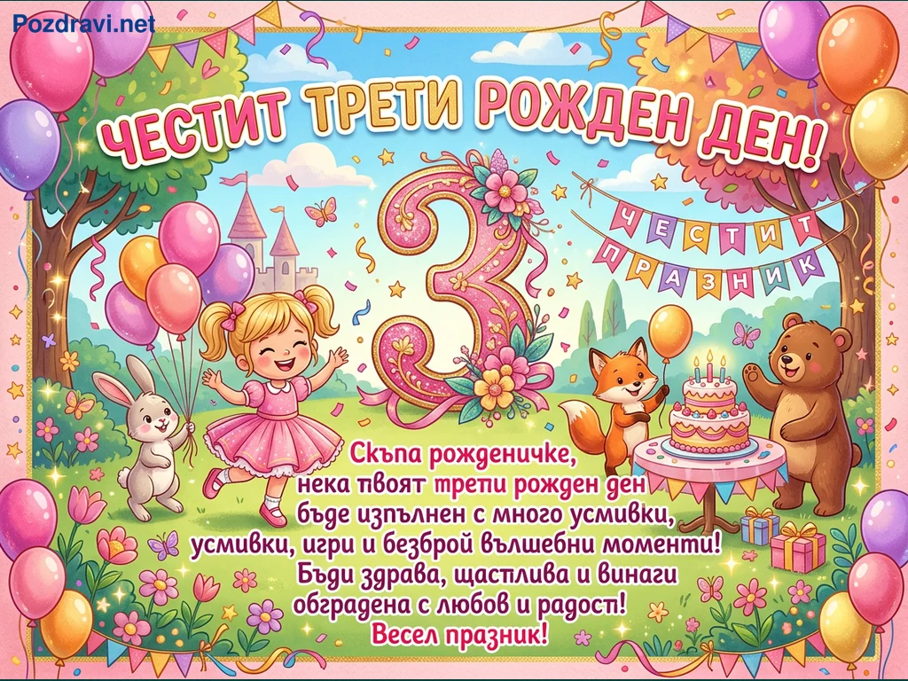 Тази цветна картичка празнува трети рожден ден с весела атмосфера. В центъра е усмихнато момиченце в розова рокля, заобиколено от балони и конфети, до голяма, богато украсена цифра '3'. Заедно с нея празнуват сладки анимационни герои – зайче с балони, лисица и мече до торта с три свещи и подаръци. Фонът включва приказен замък, дървета и празнични гирлянди, а картичката съдържа и мило пожелание за рожденичката.