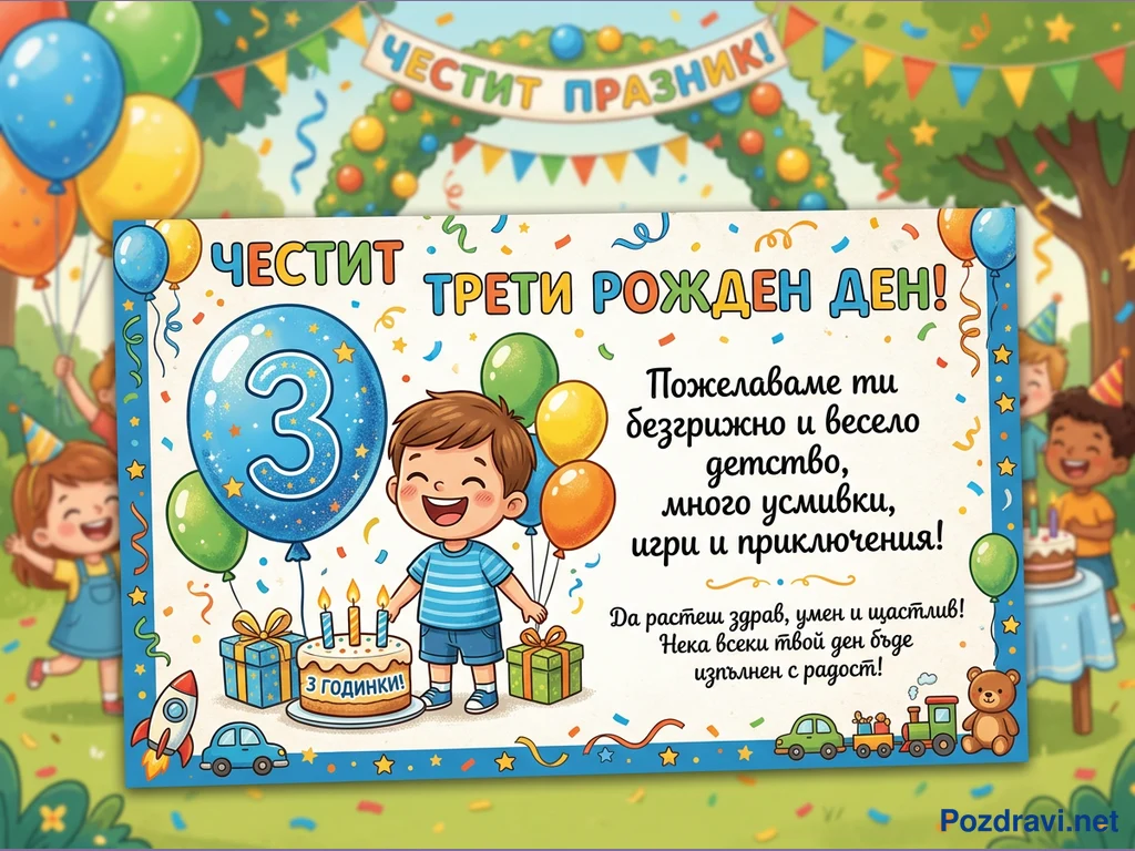 Тази цветна картичка е посветена на трети рожден ден, изобразявайки щастливо момченце с балони, торта с три свещи и подаръци. Голям син балон с цифрата '3' е централен елемент, а на заден план се виждат други деца, празнуващи в паркова обстановка с гирлянди и балони. Картичката съдържа пожелания за безгрижно детство, много усмивки, игри и приключения. Текстът също така призовава детето да расте здраво, умно и щастливо, като всеки ден е изпълнен с радост.