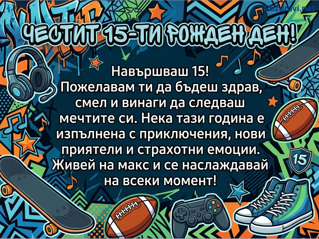 Тази дигитална картичка за рожден ден е посветена на 15-годишнина, изпълнена с младежки и енергични елементи. Фонът е тъмносин с абстрактни, графити-подобни шарки в синьо, зелено, оранжево и черно. В центъра е изписано 'ЧЕСТИТ 15-ТИ РОЖДЕН ДЕН!' с обемни букви, придружено от пожелание за здраве, смелост и приключения. Около текста са разположени слушалки, два скейтборда, две топки за американски футбол, гейм контролер и кецове, символизиращи интересите на тийнейджърите. Музикални ноти и звезди допълват празничната и динамична атмосфера.