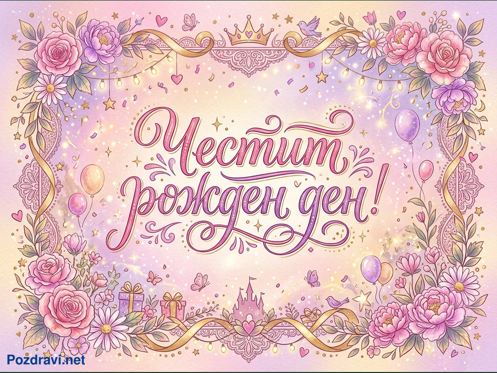 Тази празнична картичка за рожден ден е изпълнена с нежни пастелни цветове и блясък. В центъра е изписан надписът 'Честит рожден ден!' с елегантен калиграфски шрифт в розово и лилаво, подчертан със златни акценти. Композицията е рамкирана от пищна флорална украса с розови рози, божури и маргаритки, преплетени със златни панделки и дантелени мотиви. Допълнителни елементи като балони, подаръци, пеперуди, корона и силует на замък допринасят за приказната и радостна атмосфера, на фона на искрящи звезди и конфети.