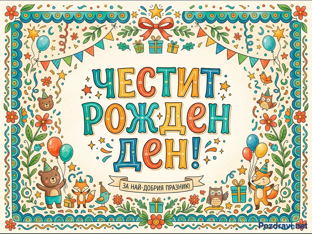 Тази илюстрация е цветна и празнична картичка за рожден ден, изпълнена с весели елементи. В центъра е изписан надписът 'ЧЕСТИТ РОЖДЕН ДЕН!' с големи, многоцветни букви, а под него банер гласи 'ЗА НАЙ-ДОБРИЯ ПРАЗНИК!'. Около текста са изобразени сладки горски животни като мечета, лисици и бухалчета, някои от които носят парти шапки, балони и подаръци. Цялата композиция е богато украсена с гирлянди, конфети, звезди, цветя и листа, създавайки радостна и игрива атмосфера.