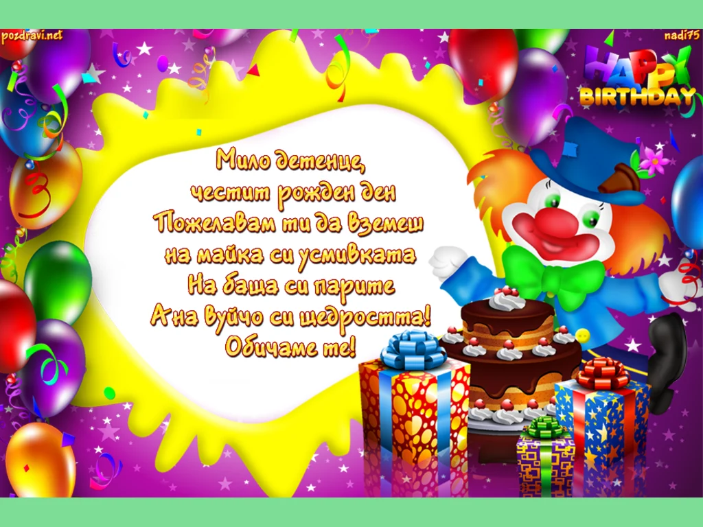 Ключови фрази: Картичка пъстра празнична рожден ден клоун торта балони подаръци звездички панделки пожелания поздрави мили дечица купон