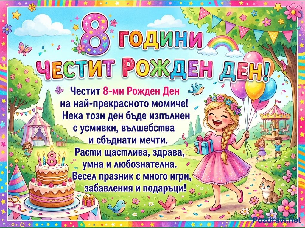 Тази цветна илюстрация е празнична картичка за 8-ми рожден ден на момиче. Тя изобразява усмихнато момиченце с плитка и цветна корона, облечено в розова рокля, което държи подарък и балони. Сцената е оживен парк с въртележка, шатра за празненства, голяма торта със свещи и разпръснати конфети. На заден план се виждат дървета, цветя, пеперуди и птички, създаващи весела и приказна атмосфера. Основният надпис гласи '8 ГОДИНИ ЧЕСТИТ РОЖДЕН ДЕН!' с пожелания за щастие и сбъднати мечти.