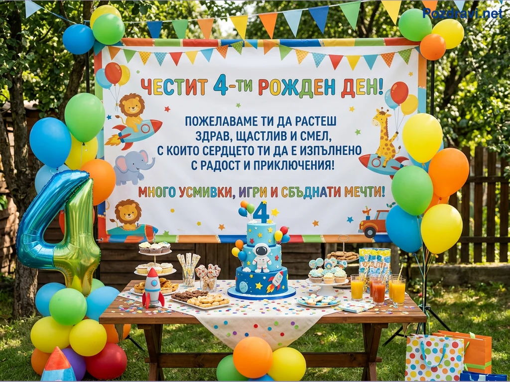 Снимката показва цветна и весела обстановка за детски рожден ден, организиран на открито в градина. Централно място заема голям банер с надпис 'ЧЕСТИТ 4-ти РОЖДЕН ДЕН!' и пожелания, украсен с анимационни животни в ракети. Пред него е разположена дървена маса, отрупана с космическа торта на етажи, кексчета, бисквити, напитки и конфети. Множество разноцветни балони, включително голям фолиев балон във формата на числото '4', допълват празничната декорация, създавайки радостна атмосфера.