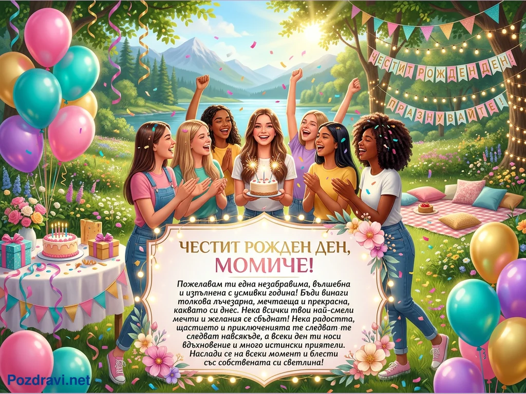 Тази жизнерадостна картичка изобразява група от седем усмихнати млади жени, празнуващи рожден ден на открито. Те са събрани в красив, слънчев парк с езеро и планини на заден план, заобиколени от цветя и дървета. Една от жените държи малка торта със светещи фонтанчета, докато останалите аплодират и се радват. Сцената е украсена с цветни балони, конфети, гирлянди и маса с подаръци и торта. В центъра има голяма поздравителна картичка с надпис 'ЧЕСТИТ РОЖДЕН ДЕН, МОМИЧЕ!' и сърдечно пожелание.