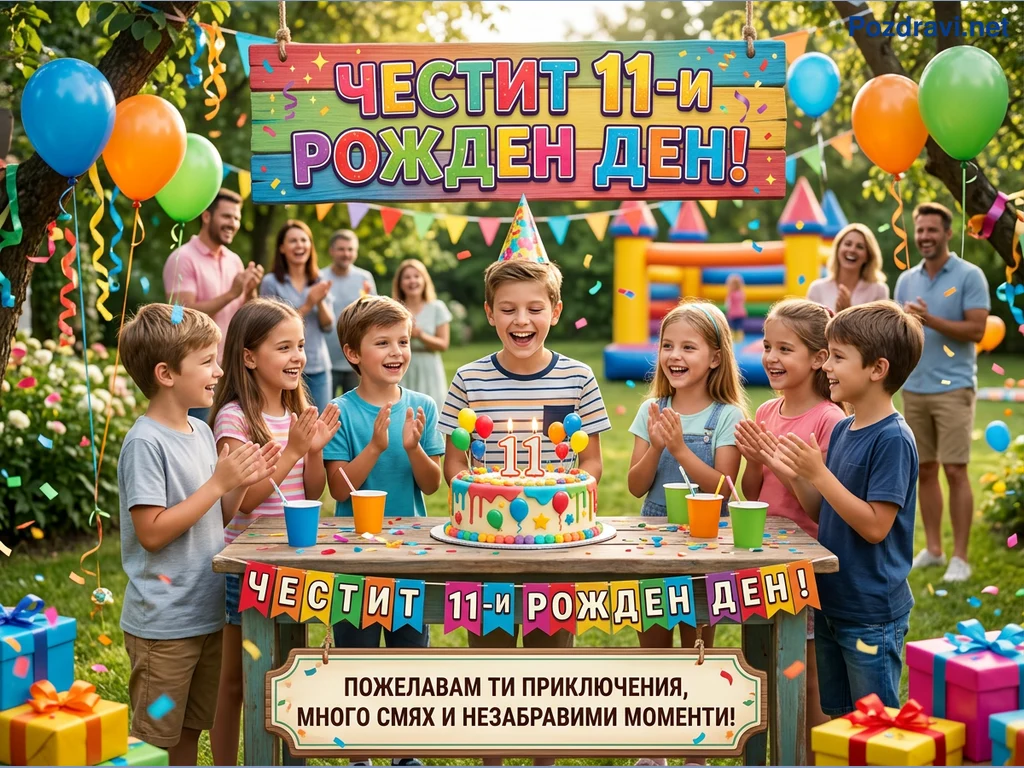 Снимката показва весело детско парти на открито, вероятно в градина. В центъра е рожденикът, момче с парти шапка, което се смее пред торта с горящи свещи във формата на числото '11'. Около него са събрани други деца, които ръкопляскат и се усмихват, а на заден план се виждат щастливи възрастни и надуваем замък. Пространството е украсено с цветни балони, конфети и гирлянди, създаващи празнична атмосфера. Над децата виси голям транспарант с надпис 'ЧЕСТИТ 11-и РОЖДЕН ДЕН!', а под масата има по-малък с пожелание.
