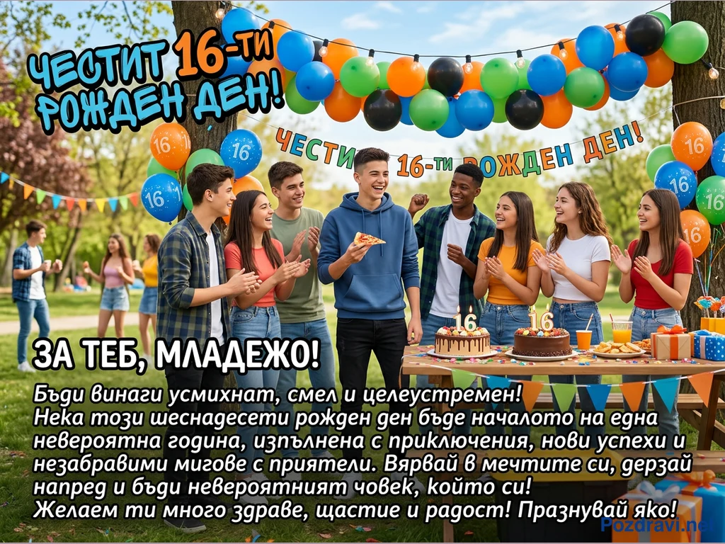 На картичката е изобразена група от усмихнати тийнейджъри, празнуващи 16-ти рожден ден на открито в паркова обстановка. Над тях висят цветни балони в синьо, зелено, оранжево и черно, както и празничен надпис 'ЧЕСТИТ 16-ти РОЖДЕН ДЕН!'. На масата пред тях има две торти с горящи свещи във формата на числото 16, напитки и закуски. Младежите изглеждат щастливи, някои ръкопляскат, а един от тях държи парче пица. Цялостната сцена излъчва радост и приятелска атмосфера.