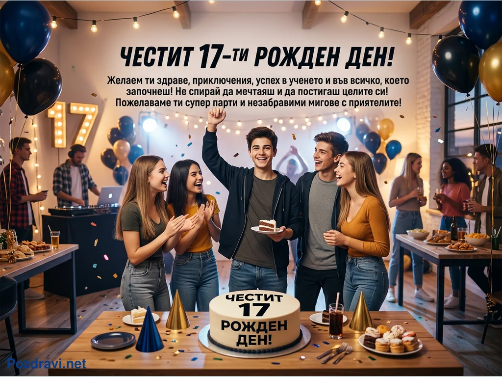 На картината е изобразено оживено парти за 17-ти рожден ден, изпълнено с младежка радост и празнична атмосфера. В центъра е група усмихнати приятели, като рожденикът държи парче торта и е вдигнал ръка от вълнение, докато около тях падат конфети. На преден план има голяма торта с надпис 'ЧЕСТИТ 17 РОЖДЕН ДЕН!', а на заден план се виждат други гости, DJ и светещ надпис '17'. Балони и различни лакомства допълват празничната обстановка, създавайки усещане за незабравим момент. В горната част на изображението има и пожелание за рожден ден.