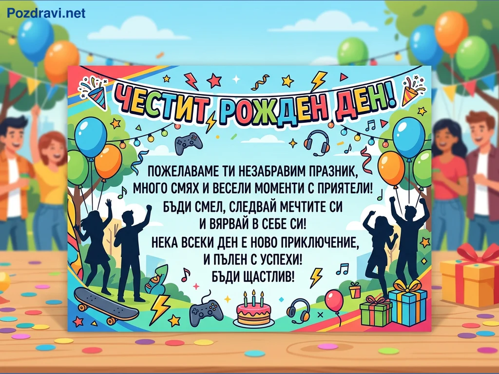 На изображението е показана ярка поздравителна картичка за рожден ден, поставена върху дървена маса, обсипана с цветни конфети. На заден план се вижда размазана сцена на весело парти на открито с млади хора, балони и дървета под синьо небе. Картичката е с надпис 'ЧЕСТИТ РОЖДЕН ДЕН!' в горната част, украсен с гирлянди, звезди и музикални ноти. Текстът съдържа сърдечни пожелания за незабравим празник, много смях, следване на мечтите и вяра в себе си. Дизайнът включва илюстрации на балони, силуети на танцуващи хора, скейтборд, гейм контролери, слушалки, торта и подаръци, подчертавайки младежка и празнична атмосфера.