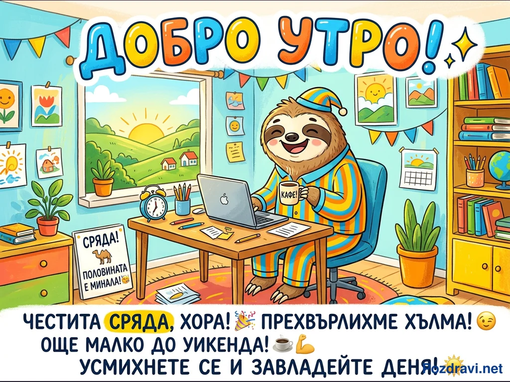 Весела картичка за добро утро, изобразяваща усмихнат мързеливец в цветна пижама, седнал пред лаптоп с чаша кафе. Зад него се вижда прозорец с изглед към слънчев пейзаж с хълмове и къщи, а стаята е украсена с гирлянди и рисунки. На бюрото има будилник и канцеларски материали, а до него – табела с надпис 'СРЯДА! ПОЛОВИНАТА Е МИНАЛА!'. Картичката носи позитивно послание 'ДОБРО УТРО!' и 'ЧЕСТИТА СРЯДА, ХОРА! ПРЕХВЪРЛИХМЕ ХЪЛМА! ОЩЕ МАЛКО ДО УИКЕНДА! УСМИХНЕТЕ СЕ И ЗАВЛАДЕЙТЕ ДЕНЯ!'.