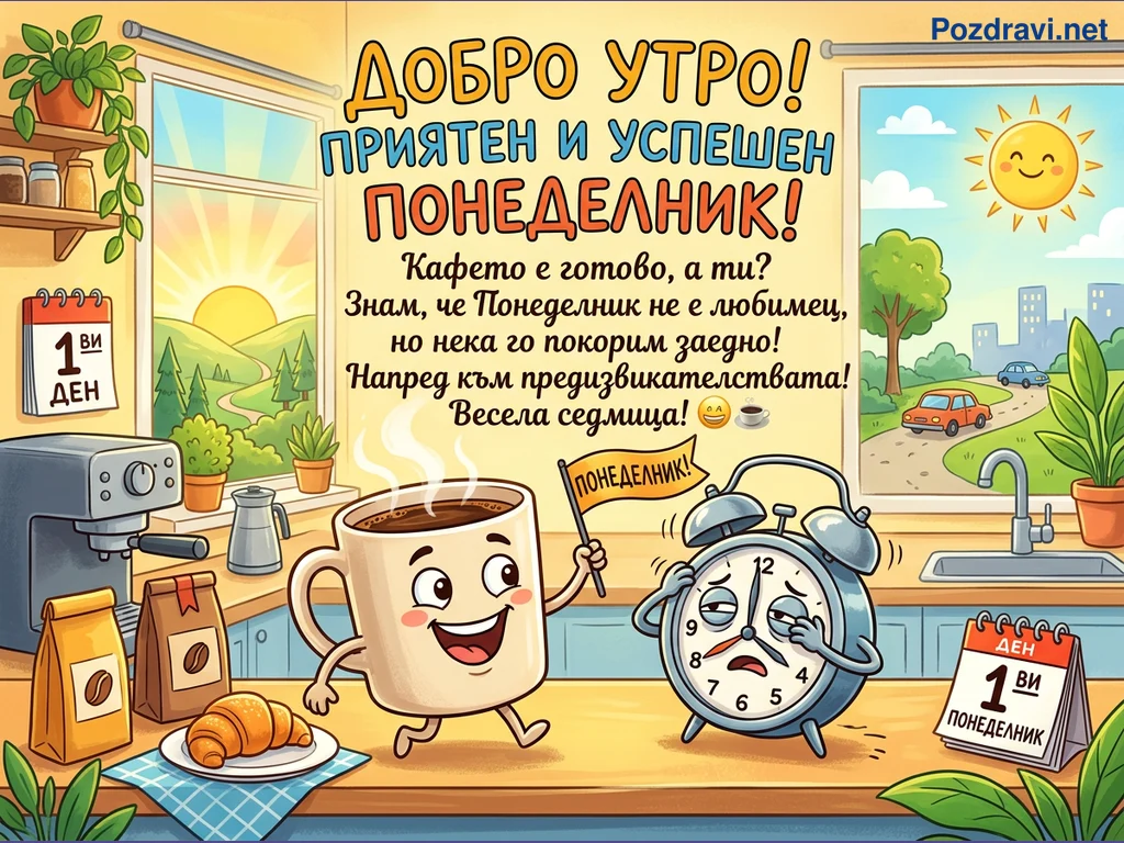 Тази весела илюстрация изобразява слънчева утрин в кухня, където през прозорците се вижда изгряващо слънце над хълмове и оживен градски пейзаж. На кухненския плот, усмихната чаша кафе с пара държи знаменце с надпис 'ПОНЕДЕЛНИК!', докато сънен будилник изразява недоволство от настъпващия ден. Около тях са разположени кафемашина, пакети кафе, кроасан и календар, отбелязващ '1ви ДЕН ПОНЕДЕЛНИК'. Картичката носи послание за добро утро и призив за покоряване на предизвикателствата на новата седмица с усмивка.