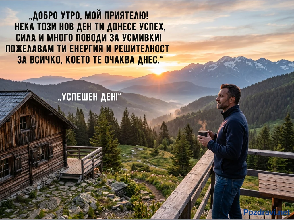 На снимката е запечатан живописен планински пейзаж по изгрев слънце. Мъж стои на дървена тераса пред уютна хижа, отпивайки от чаша и съзерцавайки мъгливата долина и величествените върхове, окъпани в златните лъчи на изгряващото слънце. Небето е обагрено в нежни оранжеви и розови нюанси, създавайки спокойна и вдъхновяваща атмосфера. Върху изображението е изписано пожелание за успешен ден, изпълнен с енергия и усмивки.