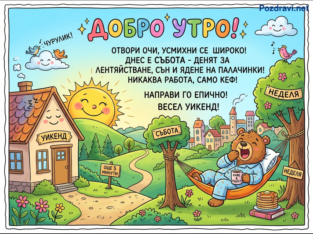 Тази илюстрация изобразява идилична утринна сцена, посветена на уикенда. В центъра, усмихнато мече по пижама се прозява блажено в хамак, държейки чаша с надпис 'Кафе & Радост', а до него има купчина палачинки. На заден план се вижда уютна къщичка с табела 'Уикенд' и изгряващо слънце, докато птички чуруликат от облак. Дърветата, на които е вързан хамакът, са обозначени като 'Събота' и 'Неделя', а на преден план има табела 'Още 5 минути'. Картичката носи послание 'Добро утро!' и приканва към лентяйстване, сън и ядене на палачинки, пожелавайки 'Весел уикенд!'.