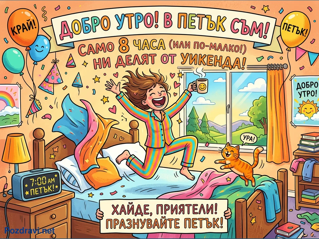Весела илюстрация показва момиче в пъстри пижами, което скача щастливо от леглото си в петък сутрин. Стаята е украсена с конфети и балони, а алармата показва 7:00 сутринта, отбелязвайки началото на уикенда. Момичето държи чаша с усмихнато лице, докато оранжева котка също скача до нея. През прозореца се вижда слънчев пейзаж, а надписи като 'ДОБРО УТРО! В ПЕТЪК СЪМ!' и 'САМО 8 ЧАСА НИ ДЕЛЯТ ОТ УИКЕНДА!' подчертават празничното настроение за настъпващия уикенд.