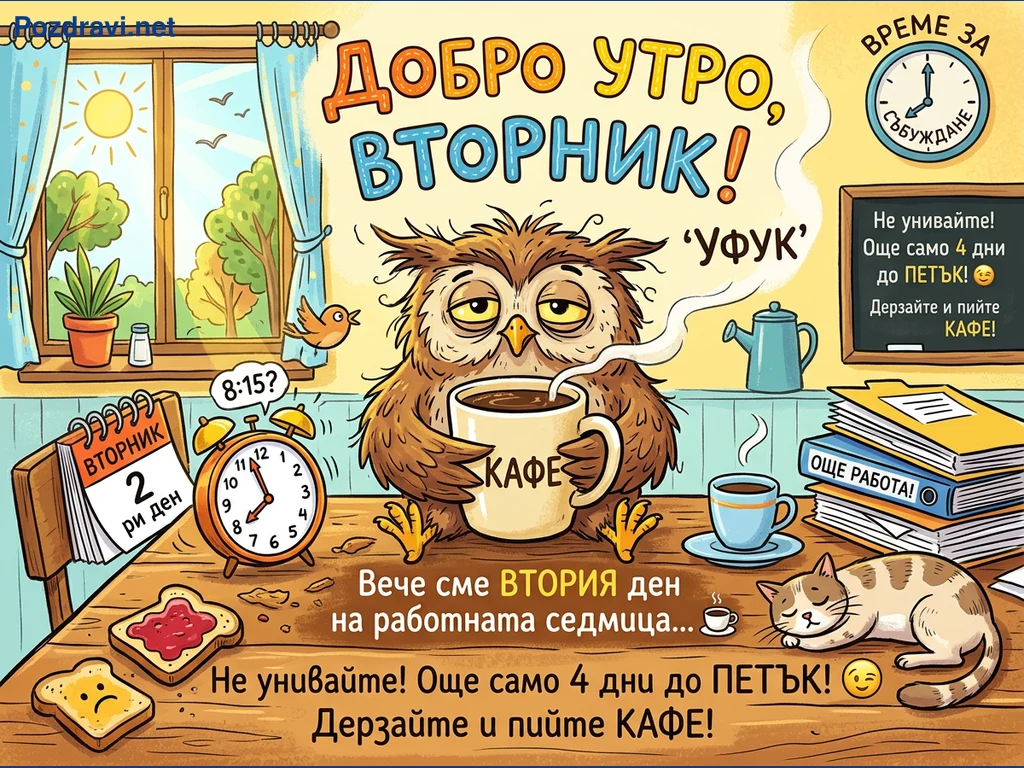 Тази илюстрация показва уморена бухал, която държи голяма чаша кафе, изпускаща пара, на фона на слънчева утрин. На масата около нея има будилник, календар за вторник, филийки с конфитюр и спяща котка, а надписът 'Добро утро, Вторник!' задава тона. Картината хумористично предава усещането за началото на работната седмица с послания като 'Още работа!' и 'Не унивайте! Още само 4 дни до ПЕТЪК!'. Общото настроение е забавно и съпричастно към сутрешната борба с кафето.