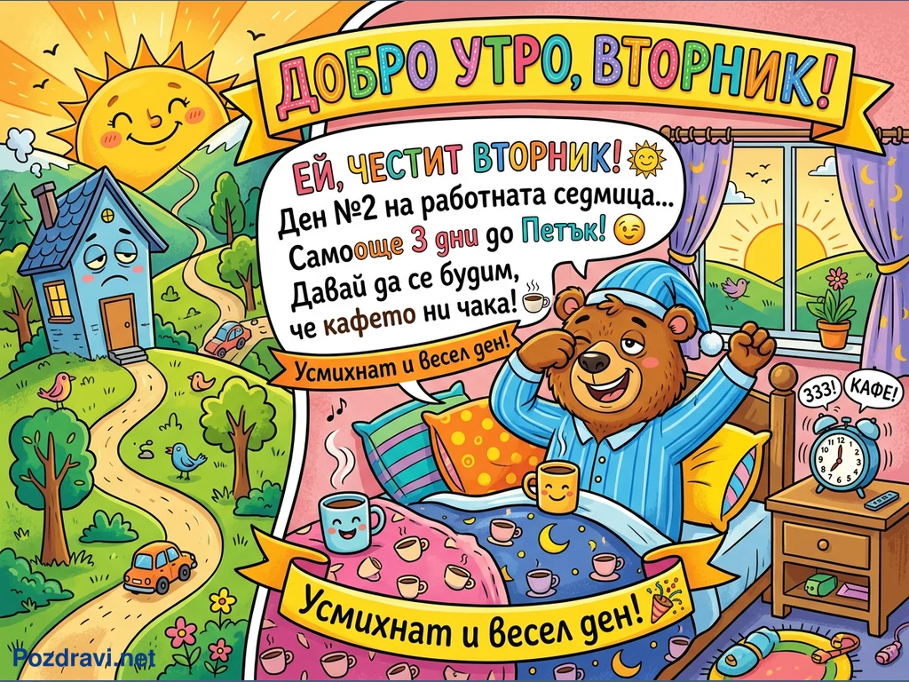 Тази цветна илюстрация е весела поздравителна картичка за вторник сутрин. В центъра е изобразено усмихнато мече в синя пижама, което се протяга в леглото си, с чаша кафе до него и будилник на нощното шкафче. През прозореца се вижда изгряващото слънце над планини, а навън има къща с тъжно изражение, път, малки колички и птички. Надписите 'Добро утро, Вторник!' и 'Усмихнат и весел ден!' допълват посланието за позитивен старт на деня. Текстът в балончето окуражава събуждането, напомняйки, че до петък остават само три дни.