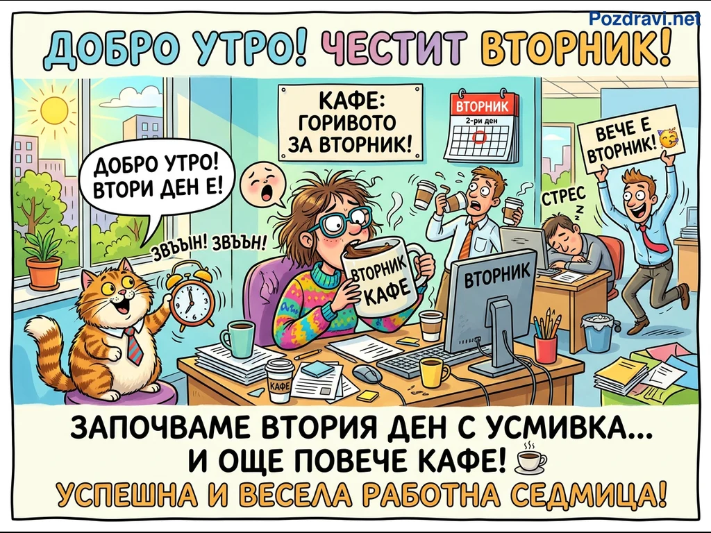 Карикатурата показва оживена офис сцена в ранна вторник сутрин, изпълнена с хумор и сатира за работната седмица. Централно място заема изтощена жена, която пие огромна чаша кафе, докато котарак с вратовръзка звъни с будилник. Около нея колеги реагират различно на вторника – от пиене на много кафе и стрес, до спане на бюрото или ентусиазирано посрещане на деня. Общото послание е за нуждата от кафе и позитивно отношение, за да се справим с втория работен ден, пожелавайки успешна и весела работна седмица.