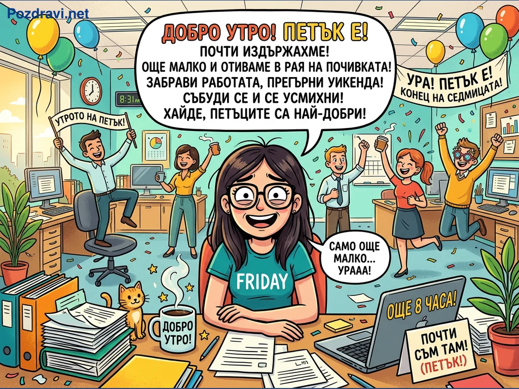 Сцената показва оживен офис, където служители празнуват настъпването на петък с балони и конфети. Централна фигура е усмихната жена с очила и тениска 'FRIDAY', седяща на бюро, отрупано с документи и лаптоп, показващ 'ОЩЕ 8 ЧАСА!'. Около нея колеги ликуват, държейки надписи като 'УРА! ПЕТЪК Е! КОНЕЦ НА СЕДМИЦАТА!' и 'УТРОТО НА ПЕТЪК!'. Общото настроение е на радост и облекчение от края на работната седмица, предвещаващо уикенда. До жената има чаша кафе с надпис 'ДОБРО УТРО!' и малко коте.