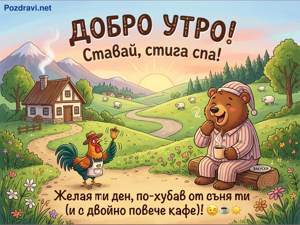 Тази весела илюстрация изобразява живописна селска сцена на изгрев слънце, изпълнена с ярки цветове и позитивно настроение. В центъра на композицията са усмихнат мечок по пижама, който пие кафе, и петел с шапка и престилка, който звъни с камбанка, сякаш събуждайки всички. Зад тях се простират зелени хълмове с пасящи овце, виещ се път и уютна къща с димящ комин, а на хоризонта изгрява слънцето над планини. Надписът 'ДОБРО УТРО! Ставай, стига спа!' и пожеланието за по-хубав ден с двойно повече кафе допълват посланието.