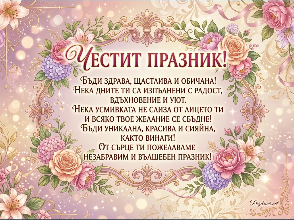 Тази празнична картичка е с нежен, искрящ фон в розови и лилави нюанси, украсен с ефект боке и фини бляскави частици. В центъра е разположен елегантен златист орнаментиран рамка, обсипана с пищни цветя като розови рози, лилави хортензии и бели лилии, допълнени от зелени листа и панделки. В рамката е изписан поздрава 'ЧЕСТИТ ПРАЗНИК!' с голям, стилизиран шрифт, последван от сърдечно пожелание за здраве, щастие, радост и вълшебен празник. Цялостната композиция излъчва топлина, красота и празнично настроение, подходяща за специален повод.
