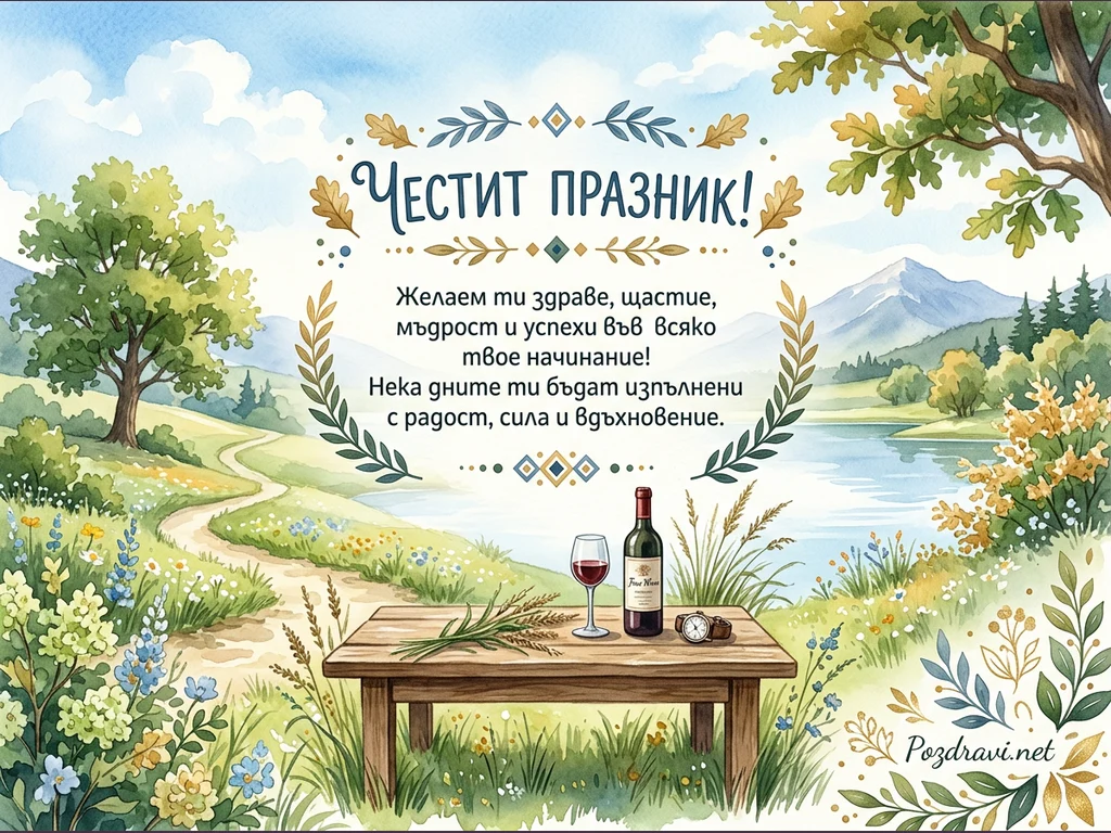 Тази акварелна картичка изобразява живописен пейзаж с езеро, планини и тучна растителност. В центъра е изписано 'ЧЕСТИТ ПРАЗНИК!' с декоративни елементи, обграждащи сърдечно пожелание за здраве, щастие, мъдрост и успехи. На преден план, върху дървена маса, са поставени бутилка червено вино, чаша, часовник и сноп житни класове, създавайки уютна и празнична атмосфера. Пътека се вие през поляна с цветя, водеща към дървета и спокойното езеро под ясно синьо небе. Цялостната композиция предава усещане за мир, радост и вдъхновение.