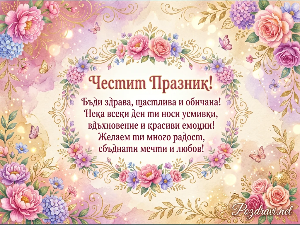 Тази празнична картичка е изпълнена с нежни цветове и елегантни детайли. Централното послание 'Честит Празник!' е обградено от рамка с пищни флорални аранжировки от розови рози, лилави и сини хортензии, и златни орнаменти. Фонът е мек акварелен преход от розово към бежово, осеян с блестящи частици и деликатни пеперуди. Картичката носи топли пожелания за здраве, щастие, усмивки, вдъхновение и сбъднати мечти, създавайки усещане за радост и обич. В долния десен ъгъл е изписан уебсайтът 'Pozdravi.net'.