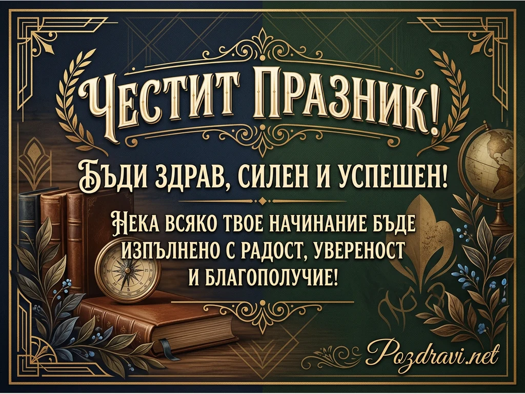 Тази елегантна поздравителна картичка е оформена в ретро стил с тъмносин и тъмнозелен фон, разделени диагонално. Тя е украсена със златни орнаменти, рамки и стилизиран шрифт, който изписва 'ЧЕСТИТ ПРАЗНИК!' и пожелания за здраве, сила, успех, радост, увереност и благополучие. В долния ляв ъгъл са изобразени стари книги и компас, а вдясно – винтидж глобус, символизиращи знание и пътешествия. Цялостната композиция е допълнена от изящни флорални елементи и носи усещане за тържественост и мъдрост.
